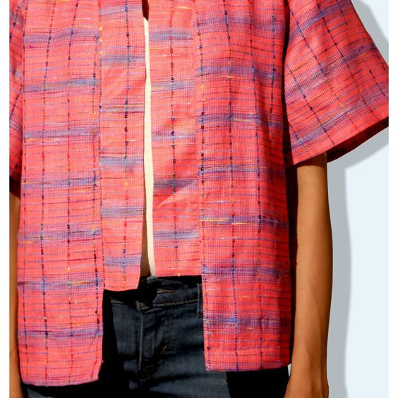 When it comes to a must have list, leave one spot open for the timeless kimono jacket. The classic kind of girl will live her life in it, and if not, there will still be a day when it just feels like the right thing to put on (weekend errands), so this makes it a wardrobe essential. This hand loom fabric used for this kimono is predominantly pink but the weave also has sky blue, yellow, green and orange threads used to create a unique, fun color play.Wear This jacket with sneakers to make a bold style statement and keep your top simple in order to put the spotlight on the oversized kimono.
