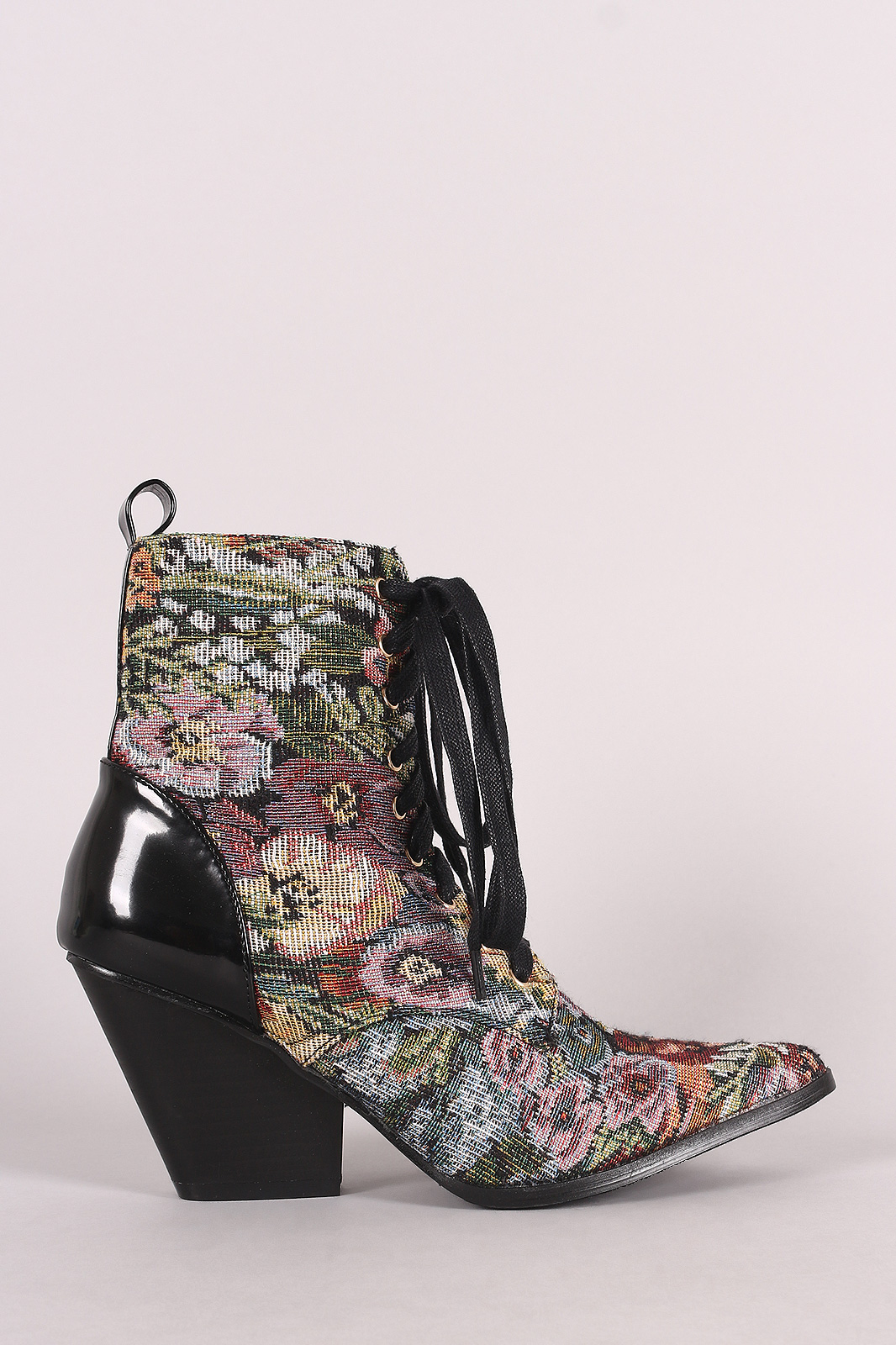 These western inspired booties feature a pointy toe silhouette, tapestry jacquard design, pull tab at the rear, and stacked block heel. Finished with a cushioned insole and lace up closure.