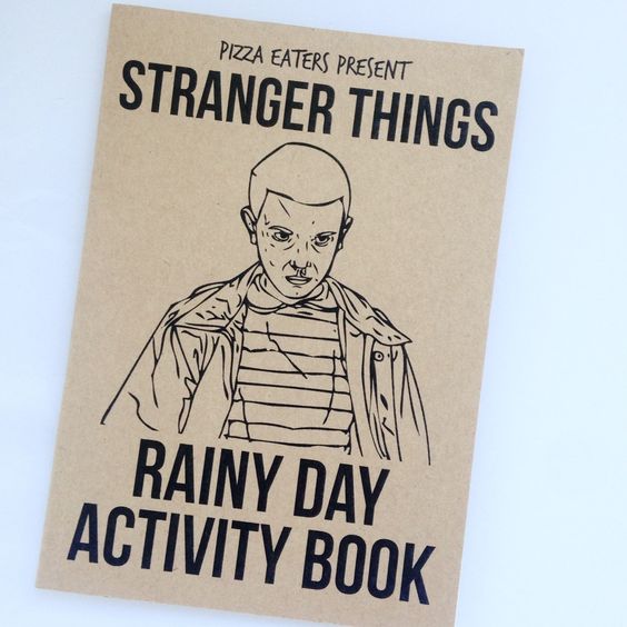 Stranger Things Rainy Day Activity Book Pizza Eaters Proudly Present a loving tribute to the amazing 80's influenced Netflix series and the activity books our parents would give us on those cold & wet winter days. Featuring Colouring Pages, Dot To Dot, Word search, Odd One Out and much more! Size: Approx 6" x 4" 16 PagesMaterials: Black Riso print on Evercopy 100gsm & Ecokraft 170gsmMade in Bristol