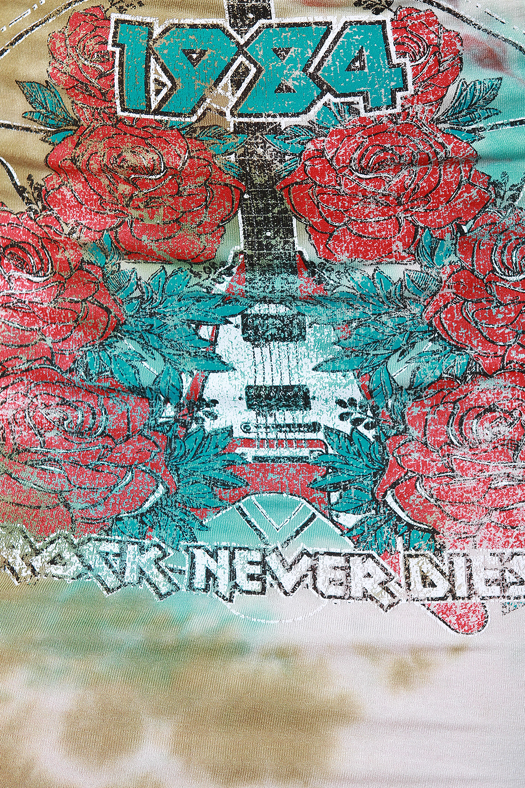 This matching set features tie dye jersey knit and graphic print. Crop top features u-neck and spaghetti straps. Skirt features pencil cut, elasticized waist, and lining. Accessories sold separately. Made in USA. Self: 95% Rayon, 5% Spandex. Lining: 95% Rayon, 5% Spandex.